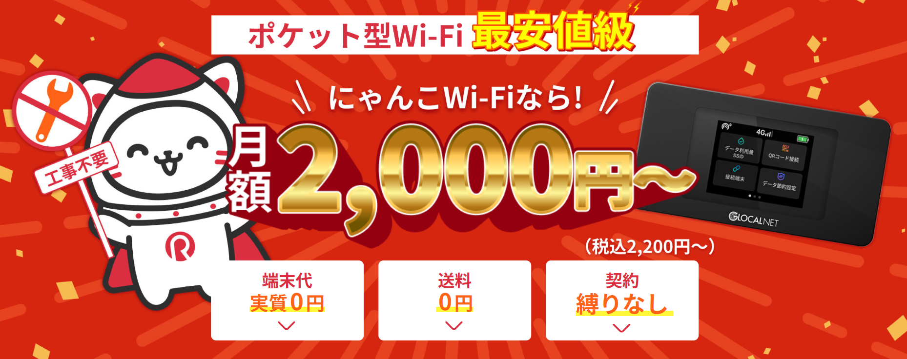 にゃんこWi-Fiは、**月額2,200円(税込)〜という業界最安級の価格**と、**契約期間の「縛りなし」**を選べる自由さが魅力のポケット型Wi-Fiレンタルサービスです。