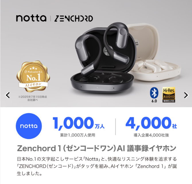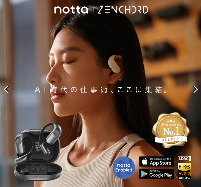AI時代の新しい仕事術、「情報は、耳から、AIへ。」をコンセプトに誕生したのが、Notta搭載AI議事録イヤホン**【ZENCHORD1(ゼンコード・ワン)】**です。