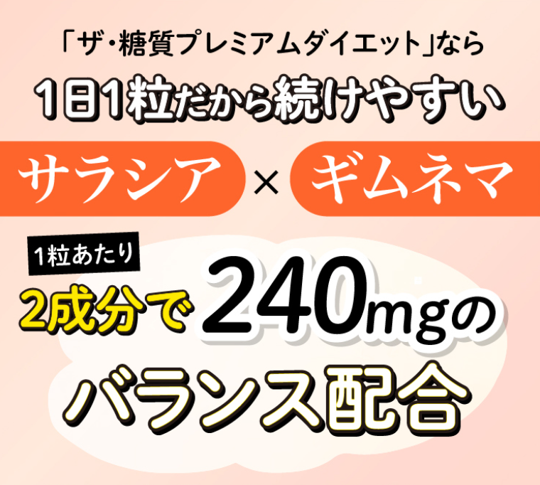 - **サラシアとギムネマシルベスタを1粒に240mgという驚異的な限界配合!**