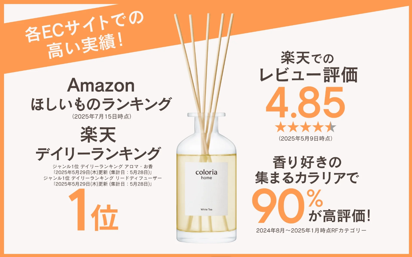 今、SNSや各種ランキングで話題沸騰中のルームフレグランス**『Coloria Home(カラリアホーム)』**。この記事では、なぜこのルームフレグランスが多くの人に選ばれ、愛されているのか、その理由を深掘りしてご紹介します。