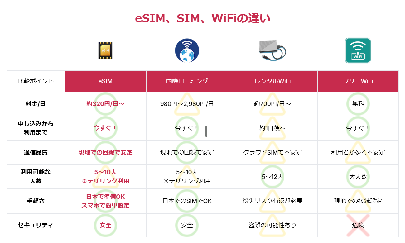 グロモバeSIMは、従来のSIMカードやWi-Fiルーターと比べ、旅行者にとって多くの利点があります。