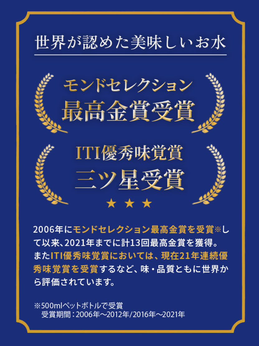 これほどまでに長期間、世界的な評価を受け続けている水は他に類を見ません。まさに「選んで間違いのない水」と言えるでしょう。