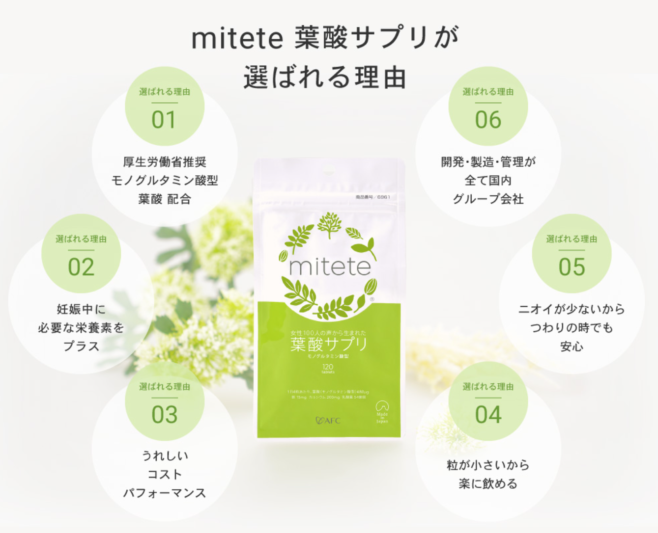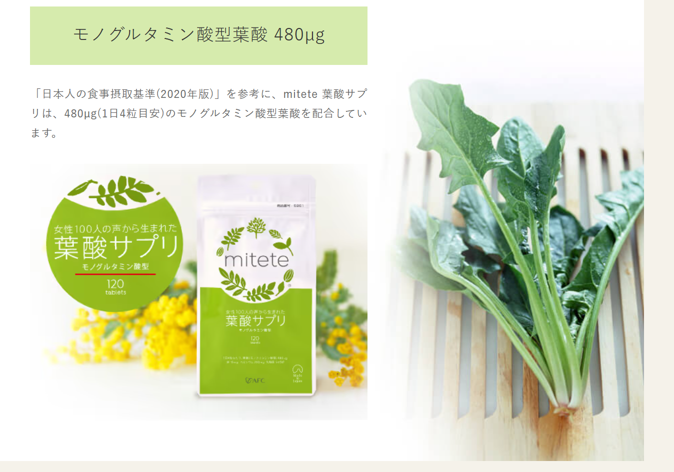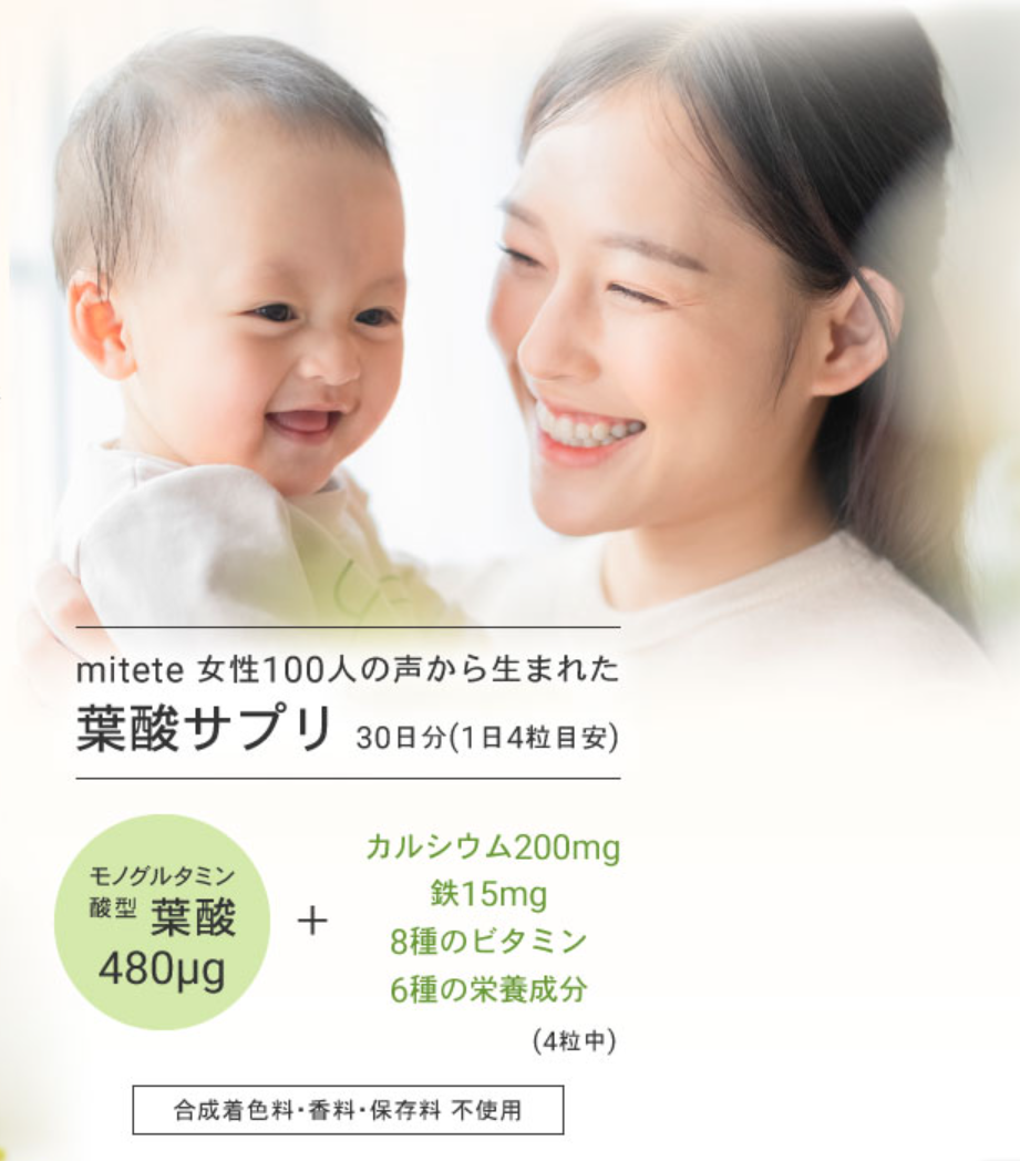 そんな不安や願いを抱える女性100人の切実な声から生まれたのが、AFC(エーエフシー)の「mitete 葉酸サプリ」です。