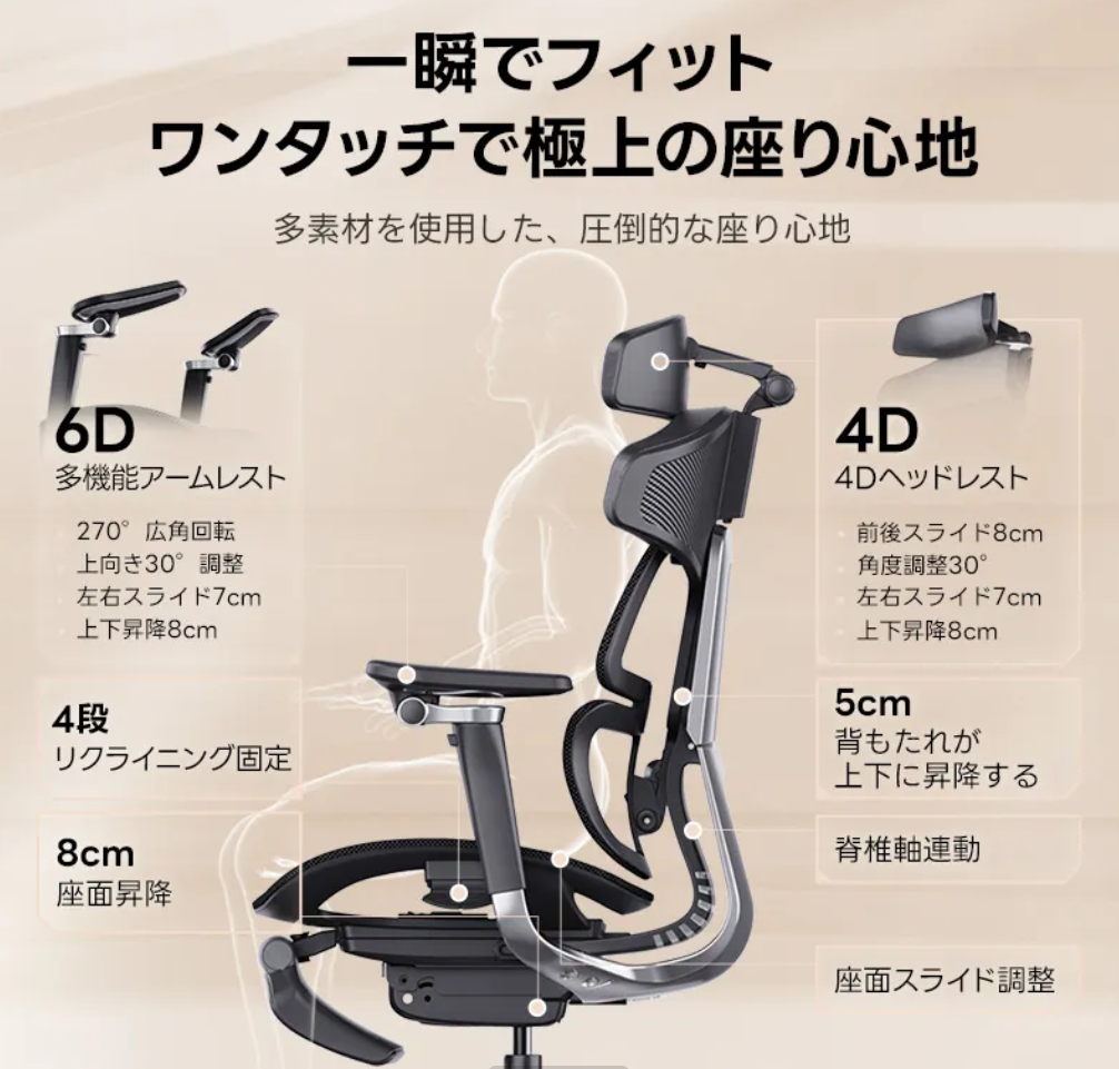 人間工学に基づいた設計で、長時間のデスクワークでも疲れにくい姿勢をしっかりケア。集中力を維持したいプロフェッショナルからも高く評価されています。