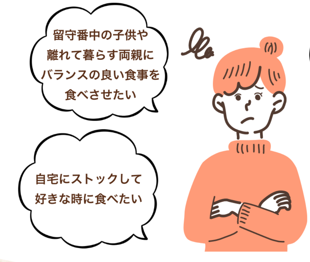 「仕事で遅くなった日に、コンビニ飯が続くのは避けたい」「一人暮らしの親の食生活が心配だけれど、毎日は通えない」「カロリーや塩分を考えた料理を作るのが、正直しんどい…」