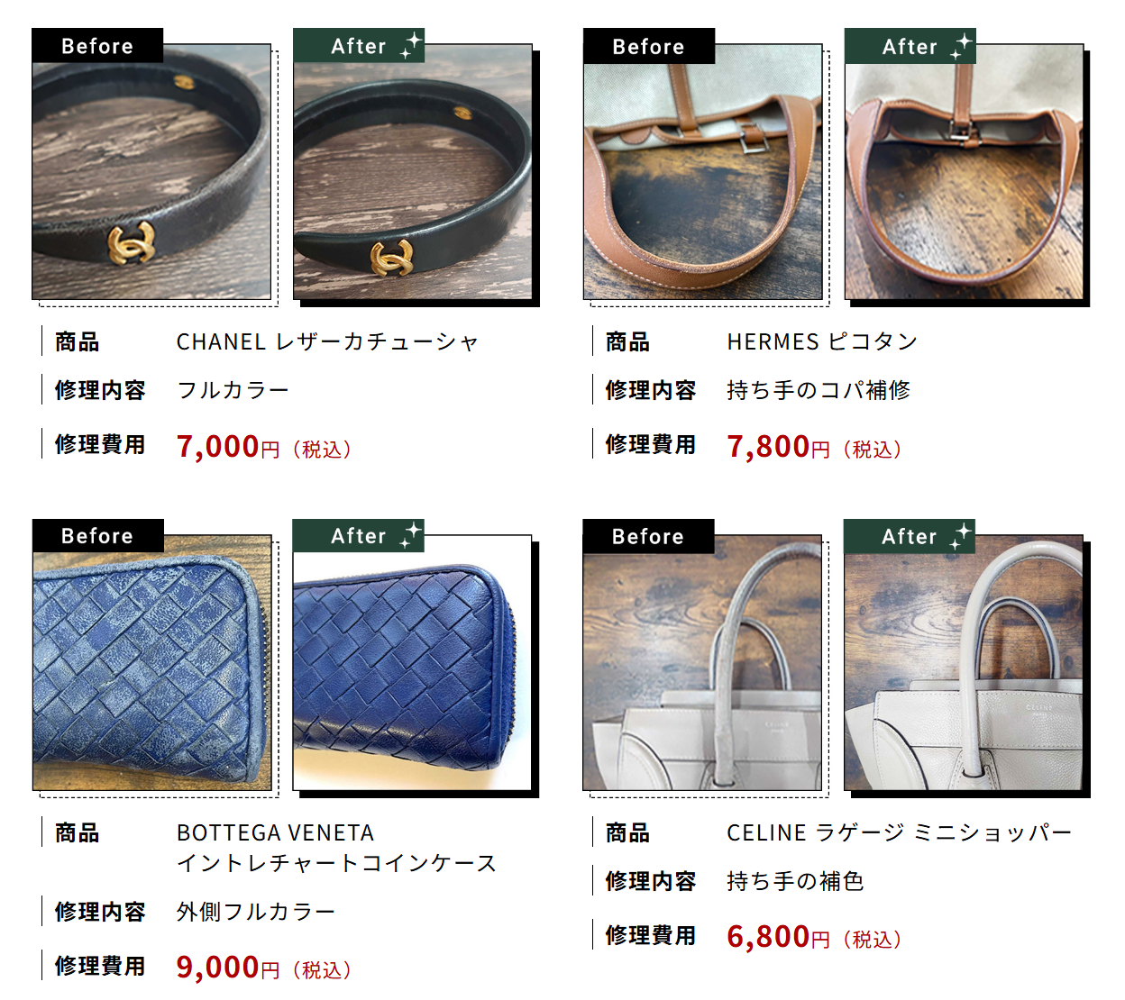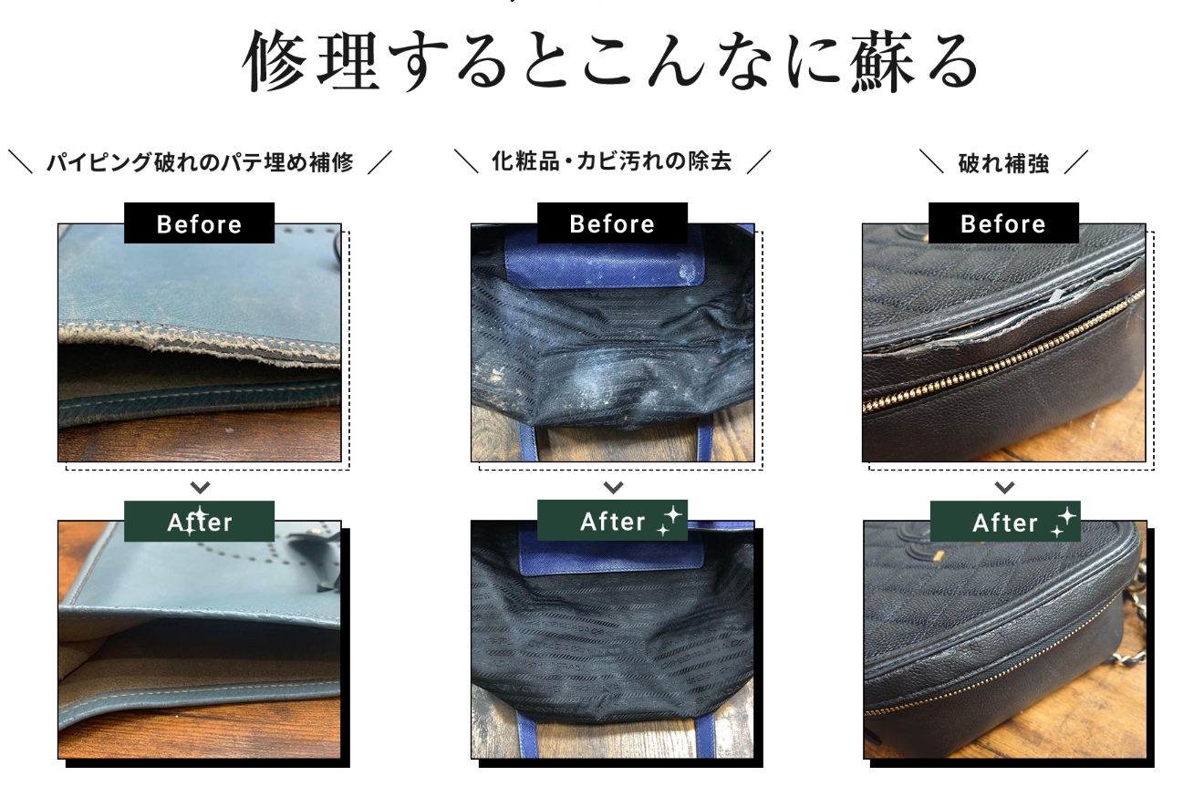 「お気に入りだったけれど、色が剥げてしまったブランドバッグ」「母から受け継いだ思い出の財布、でも傷みが激しくて外に出せない」「キャンバス地のシミが取れなくて、使うのをためらってしまう…」