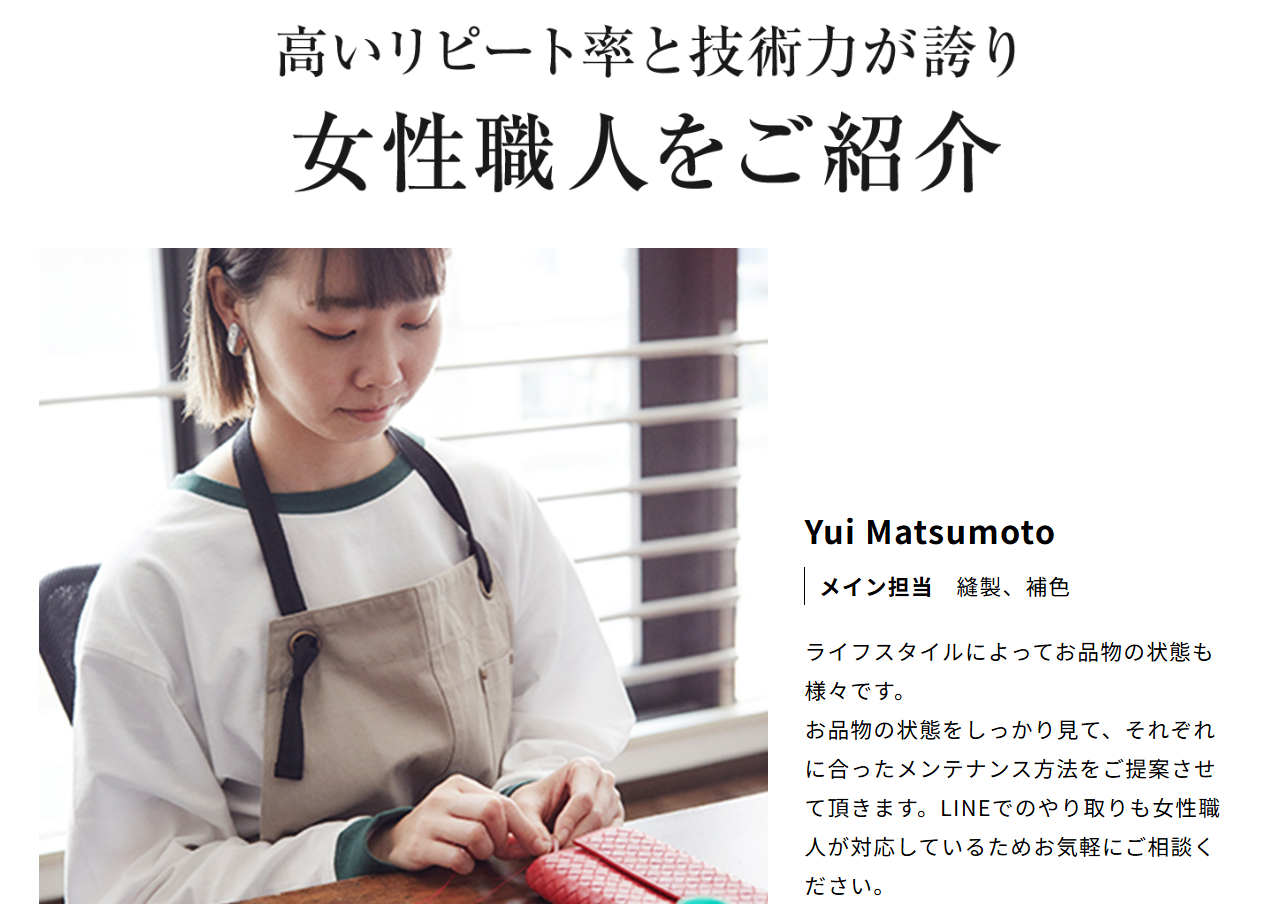 REPAIR THING(リペアシング)の最大の特徴は、第一線で活躍する20代から30代の女性職人たちが中心となって修理を行っている点です。レザーバッグや財布を知り尽くした彼女たちの技術は、まさに一流。