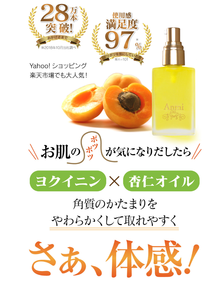 アンミオイルは、杏仁の力を最大限に引き出し、大人の女性の悩みに真っ向から向き合ったこだわりの製品です。ザラつきやポツポツに悩む時間を、自分をいたわる心地よいセルフケアの時間に変えてみませんか?