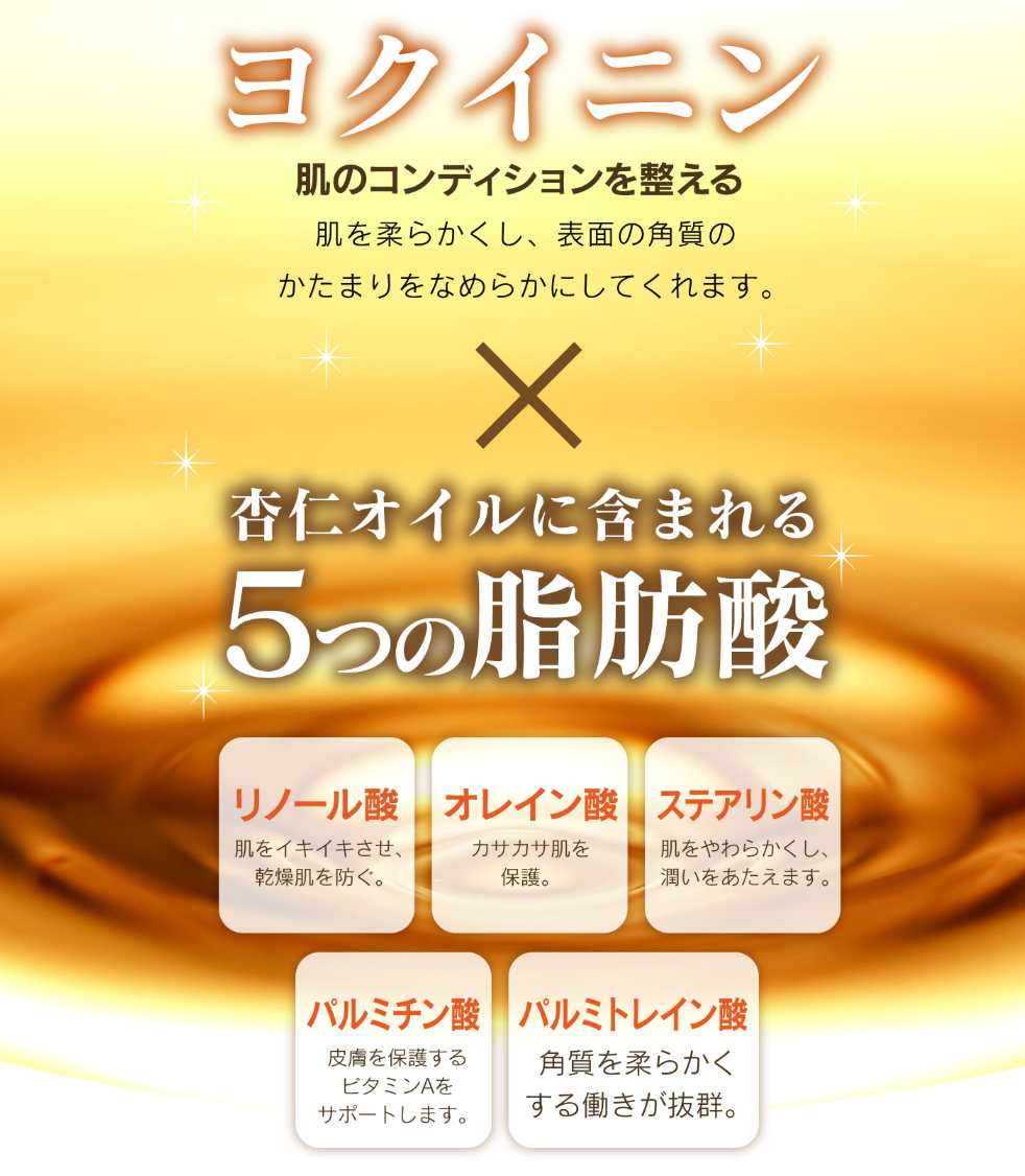 杏仁オイルには、大人の肌コンディションを整える5つの主要な脂肪酸(パルミトレイン酸、リノール酸、オレイン酸、ステアリン酸、パルミチン酸)が含まれています。特に「パルミトレイン酸」は、年齢とともに硬くなりがちな角質を柔らかくほぐす働きに優れており、なめらかな肌質へと導いてくれます。