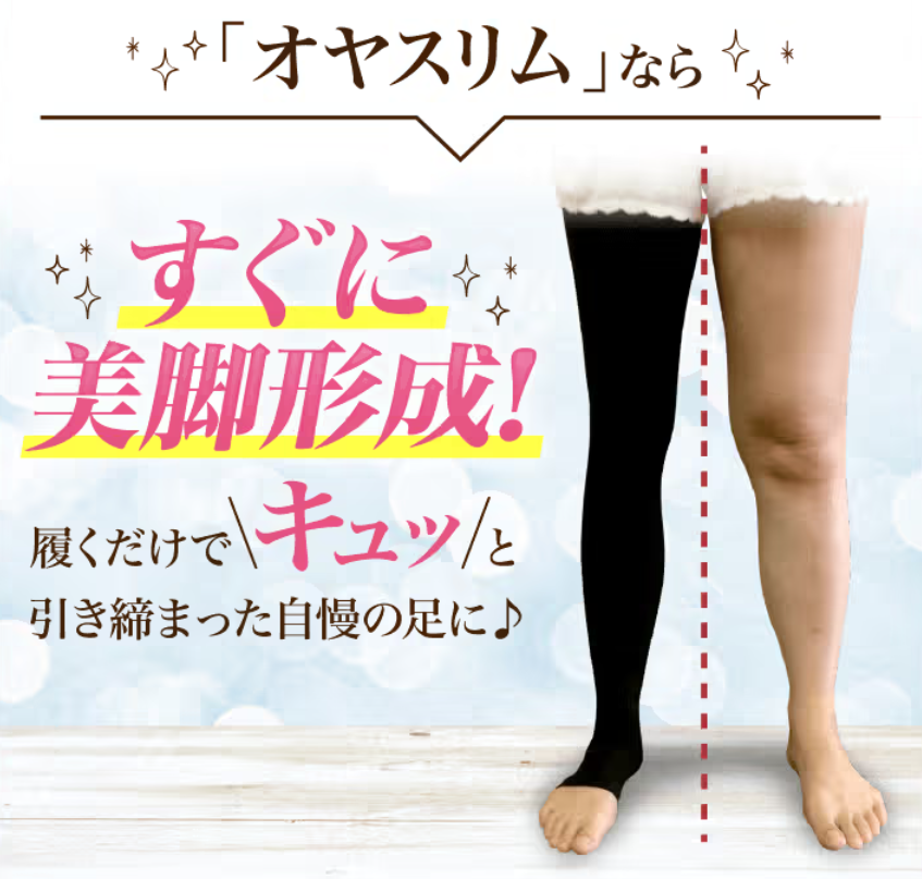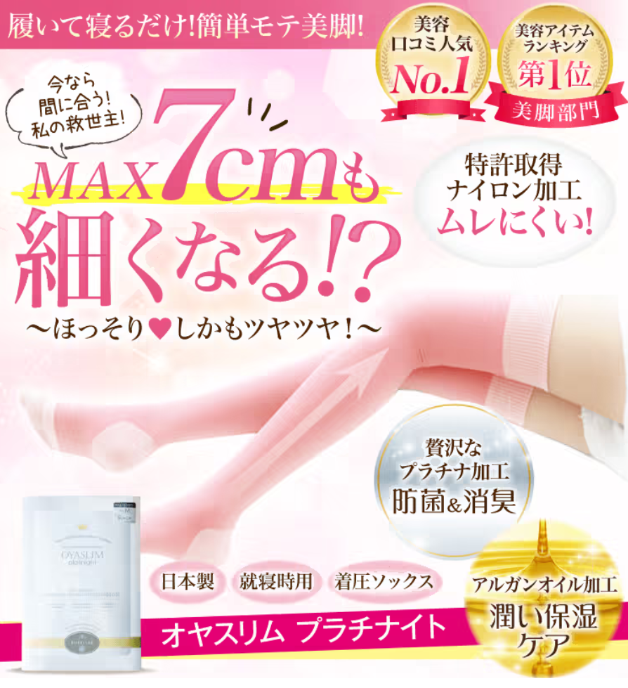 オヤスリムプラチナイトは、心地よい着圧で理想のラインをサポートし、ずり落ちない設計で快適な眠りを守る、まさに大人の女性のための美脚アイテムです。