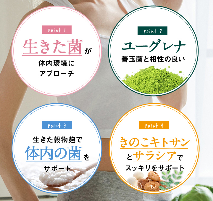 理想のクビレボディへ近づくためには、腸内の善玉菌を優勢に保つことが非常に重要です。クビレ バイ ユーグレナには、ユーグレナと非常に相性の良い厳選された成分が凝縮されています。