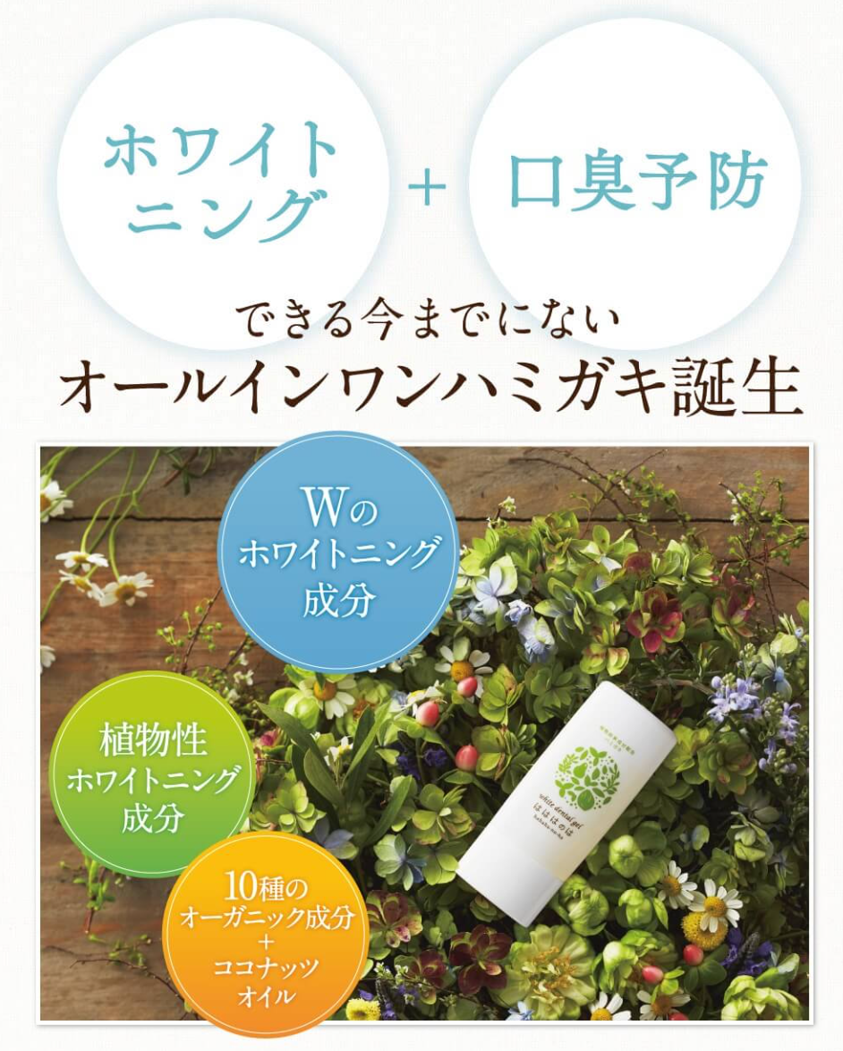 一般的なホワイトニング歯磨き粉によくある「研磨剤で削り取る」手法は、歯のエナメル質を傷つけるリスクがありますが、その心配がありません。さらに、10種類のオーガニック成分を配合。デリケートな大人世代の口内環境を優しく守りながら、健康的な白さを目指せる設計になっています。