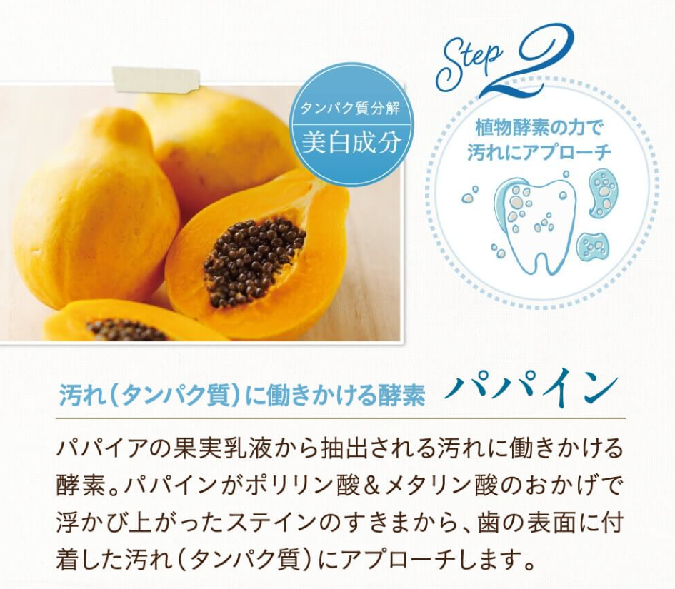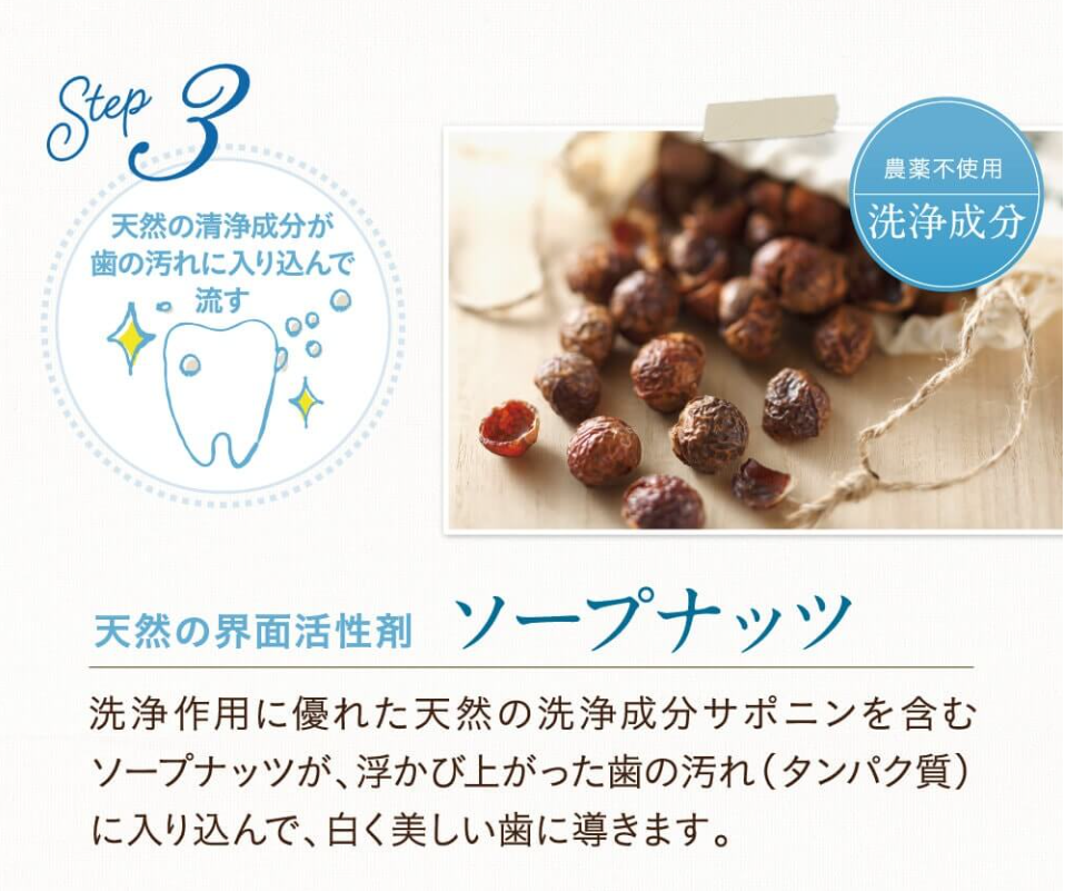 青パパイヤから抽出される酵素パパインが、歯の表面の汚れを分解。さらに、天然の界面活性剤とも呼ばれるソープナッツが、浮いた汚れを包み込んでスッキリと洗い流してくれます。天然成分の力を借りることで、歯をいたわりながら理想の白さを追求できるのが魅力です。
