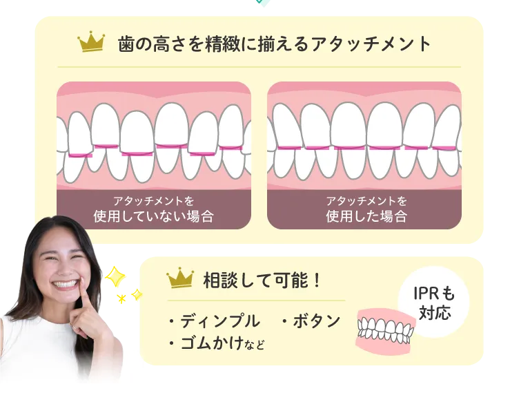食事や歯磨きの際には取り外すことができるため、お口の中を清潔に保ちやすく、普段通りの食事を楽しめるのも嬉しいポイント。矯正中であることを忘れるほどストレスフリーな毎日を過ごしながら、着実に美しい歯並びへと近づいていきます。