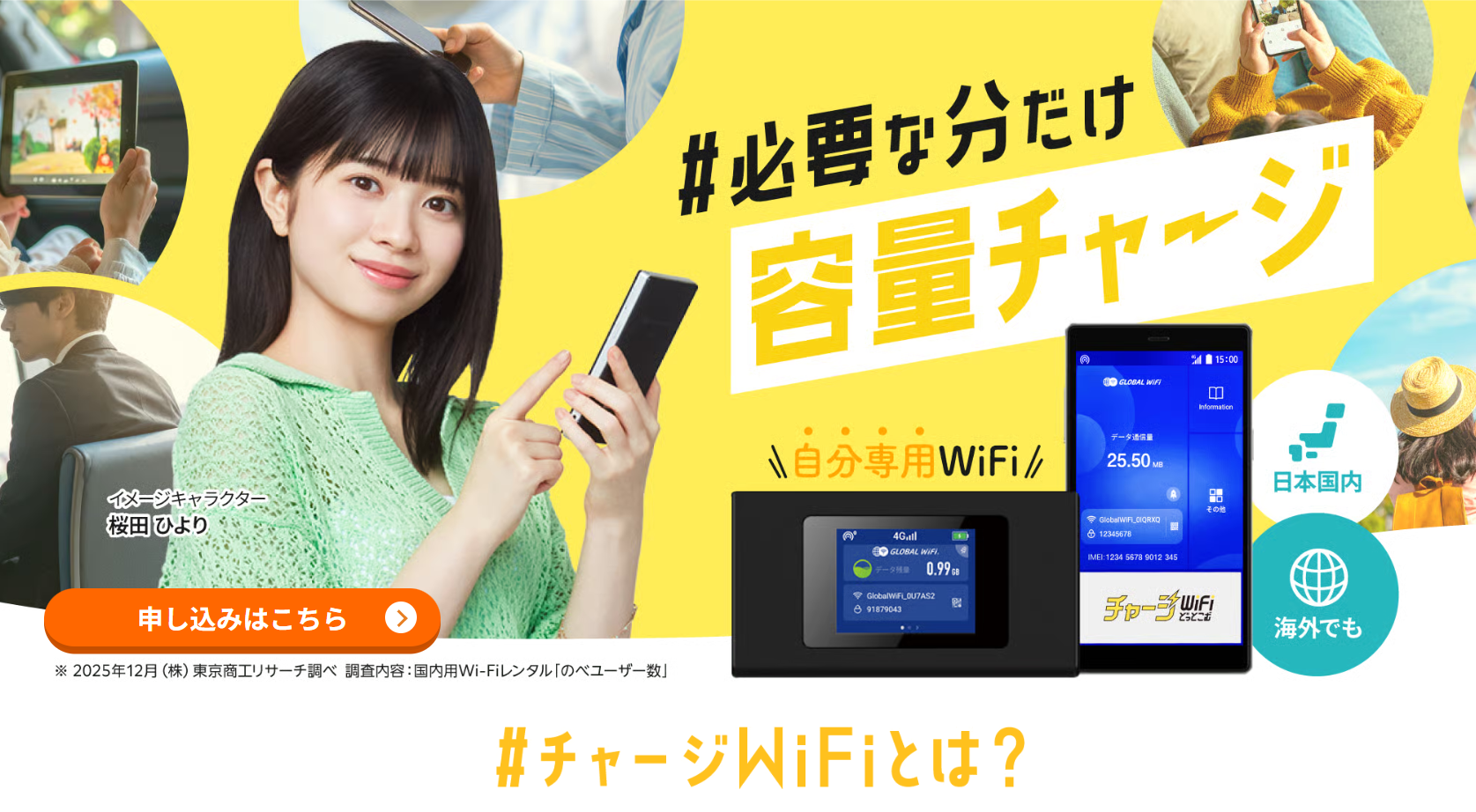 そんなWiFiにまつわる「もったいない」や「面倒」をすべて解決してくれるサービスが登場しました。国内用WiFiレンタルで7年連続No.1(※)の実績を持つ、あの有名サービス「WiFiレンタルどっとこむ」の運営会社が提供する、全く新しい形のWiFiサービス。それが「チャージWiFiどっとこむ」です。