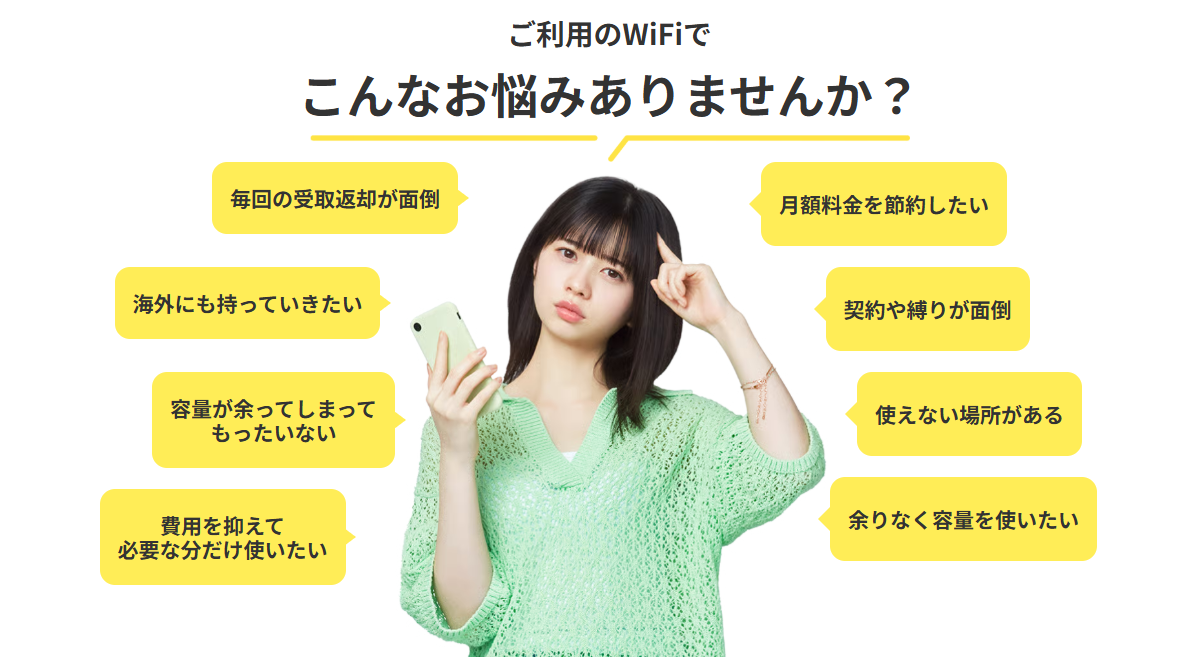 「毎月の固定費を少しでも削りたい」「たまにしか使わないのに月額制のWiFiを契約するのはもったいない」「レンタルWiFiの受取や返却の手間が本当に面倒…」「海外旅行のたびにWiFiを借り直すのがストレス」