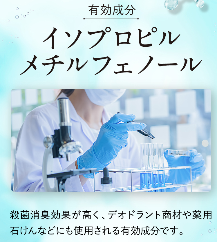 インナーブランが他のミストと決定的に違うのは、一時的な香り付けによる「ごまかし」ではない点です。厚生労働省が認めた医薬部外品であり、有効成分「イソプロピルメチルフェノール」がニオイの元となる雑菌を徹底的に除菌します。