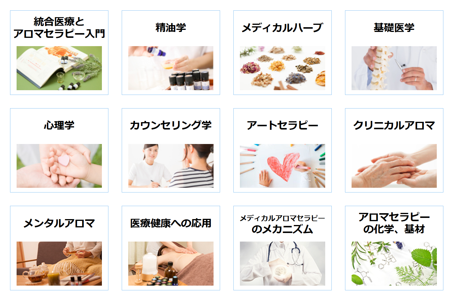 クリニカルアロマとは、精油の成分や薬理作用を理解し、補完代替医療の一環として活用する実践的なスキルです。本講座は、日本統合医学協会が監修しており、全12科目にも及ぶ幅広いカリキュラムが用意されています。