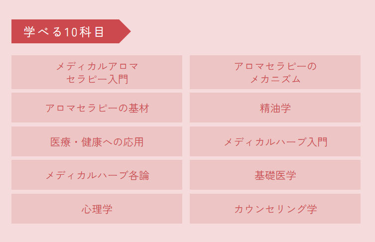 一般的なアロマ講座との決定的な違いは、その専門性にあります。本講座は、精油の基礎知識はもちろんのこと、心理学やハーブ学、解剖生理学など、統合医療に関連する全10科目を網羅しています。